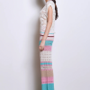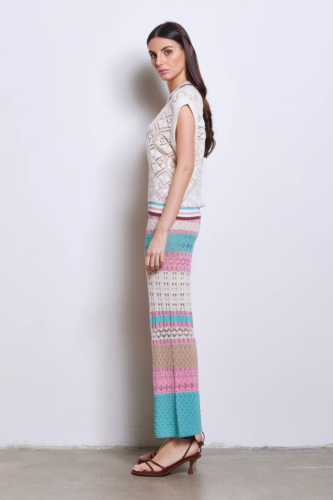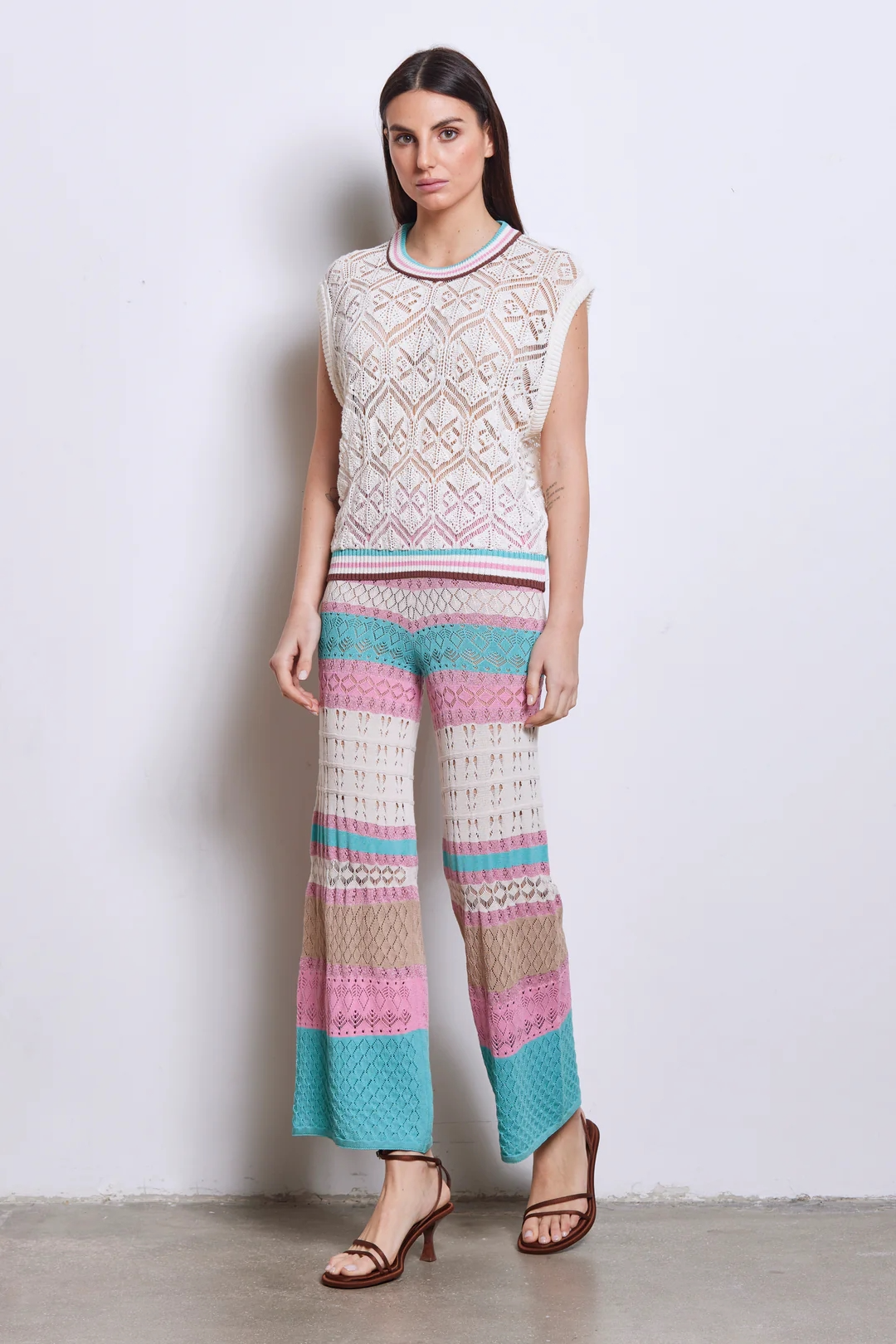 Knit vest, crochet stitch work with contrasting striped details on neck and bottom of vest, loose fit