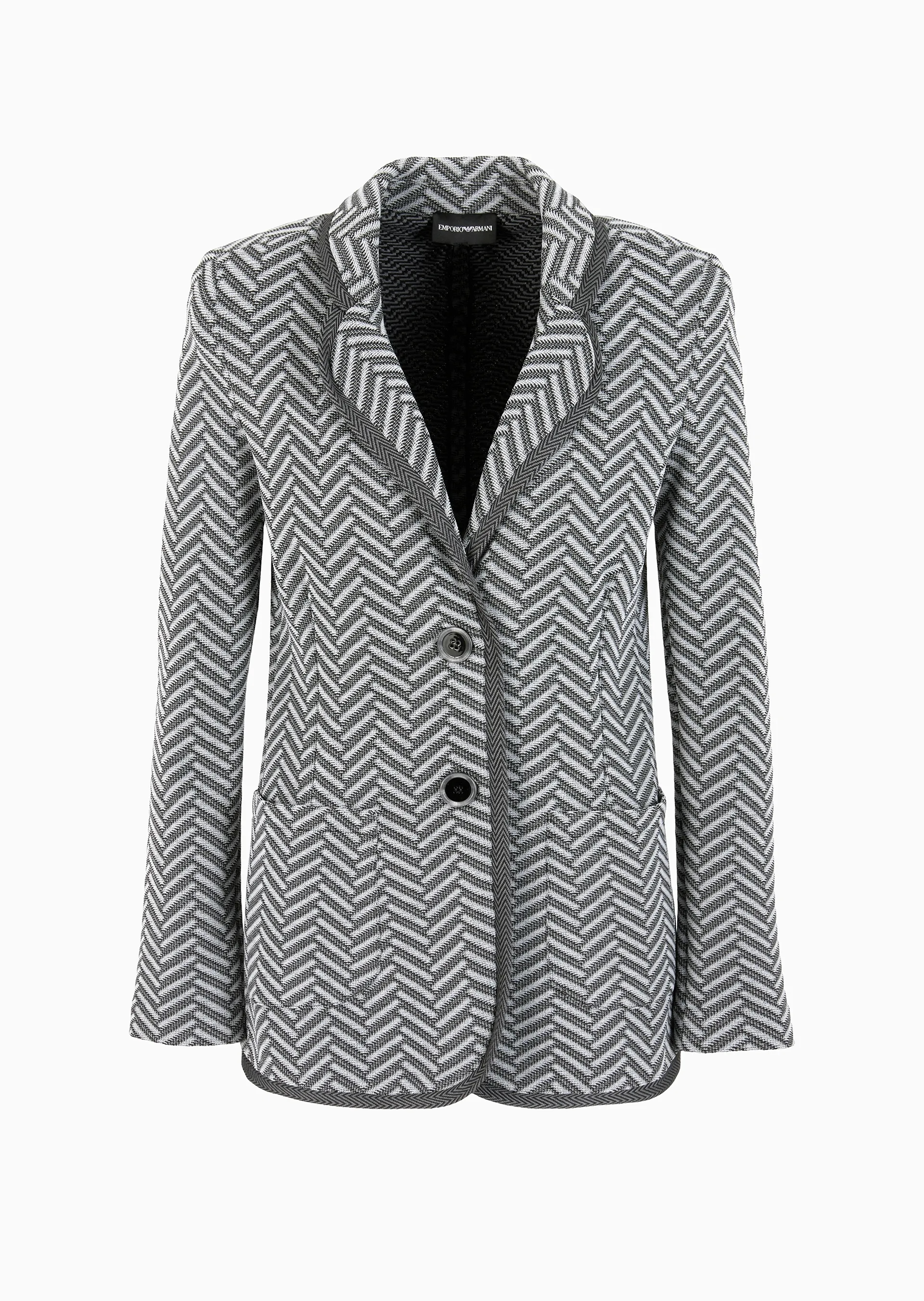 Single-breasted blazer with rounded lapels at the neckline. Made of a knit-effect jersey with the hallmark chevron motif that has a sophisticated embossed look thanks to the expertly crafted jacquard that runs across the entire style, enhancing its exclusive allure.