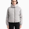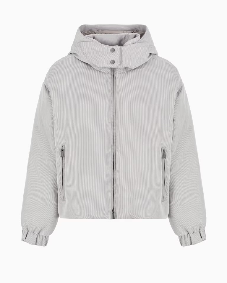 Down jacket with detachable hood featuring padding made from certified recycled material. The recycled down padding is a 100 sustainable, ecological material, resulting from a careful recycling process using select down that can no longer be sold, in order to reduce manufacturing waste without sacrificing the down’s inherent thermal performance and hypo-allergenic qualities. This corduroy texture combined with its water-repellent properties, as described by the patch stitched inside, make it a perfect outerwear piece to be worn on any occasion, while maintaining functionality, durability and style.
