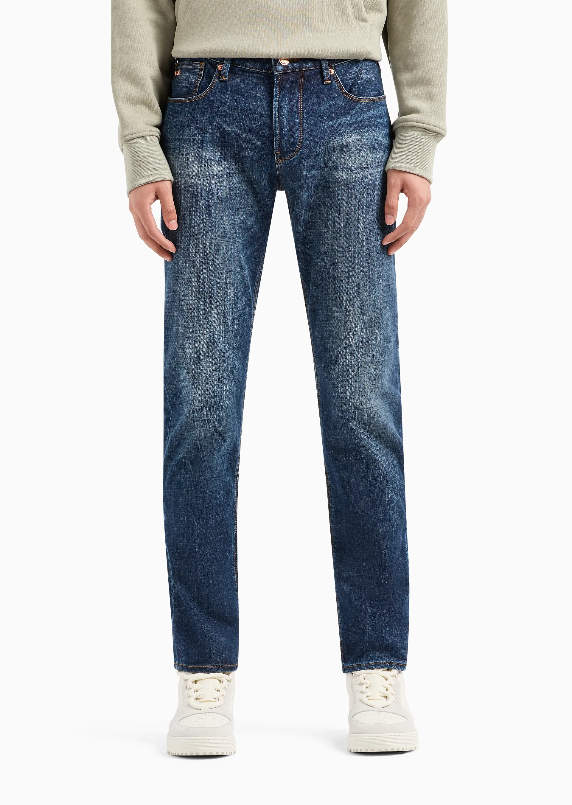Men’s jeans made from stretch cotton denim are a perennial wardrobe classic: the style has a narrow leg, low-rise and a zip fly.