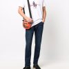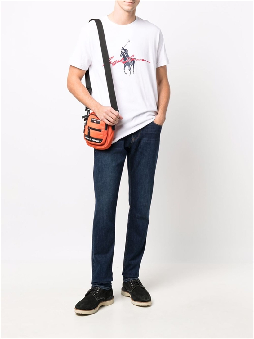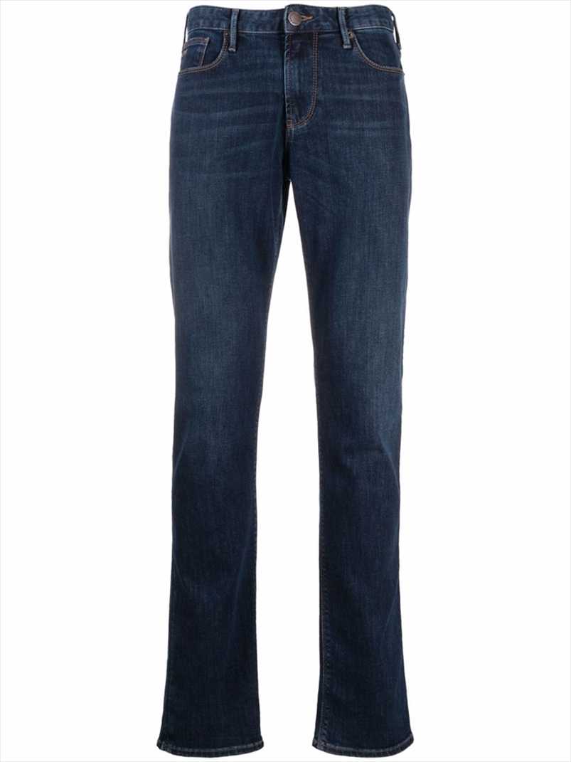 stretch-cotton denim contrast stitching mid-rise button fly fastening belt loops classic five pockets straight leg