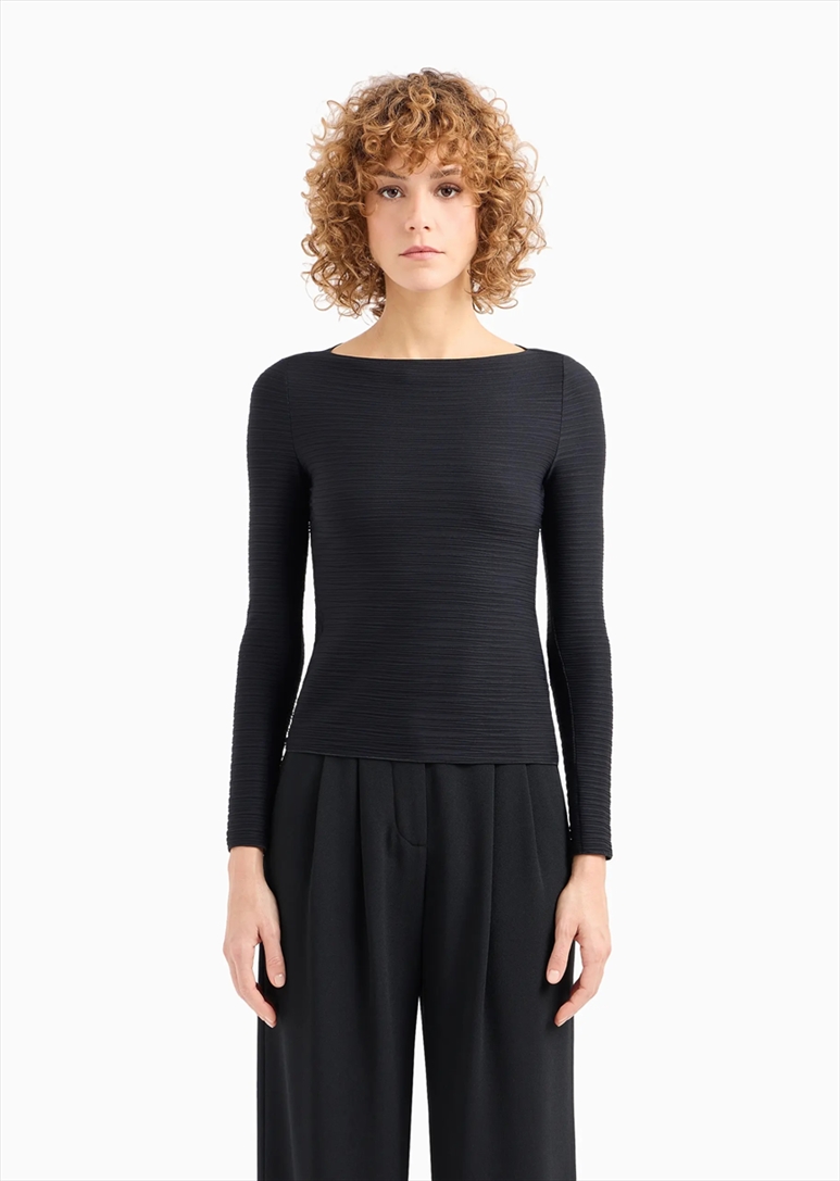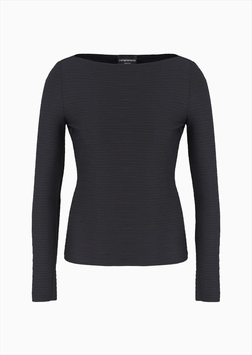 Boat-neck jumper whose essential design blends perfectly with the stretch fabric with an all-over sophisticated raised weave. Through non-stop research and development into fabric, shapes and cuts, Emporio Armani reinvents classic wardrobe items, making them unique.