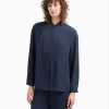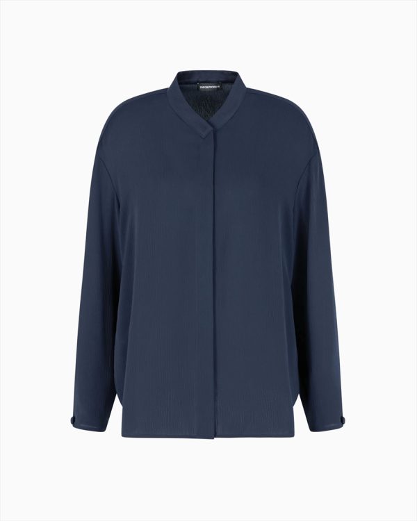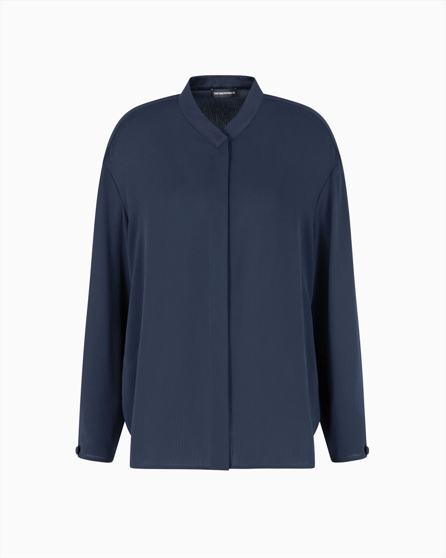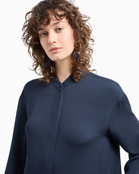 Shirt with a concealed fastening. It is made of crépon fabric, recognisable by its airy fluidity and an elegant crinkled pleated effect that adds a touch of texture.