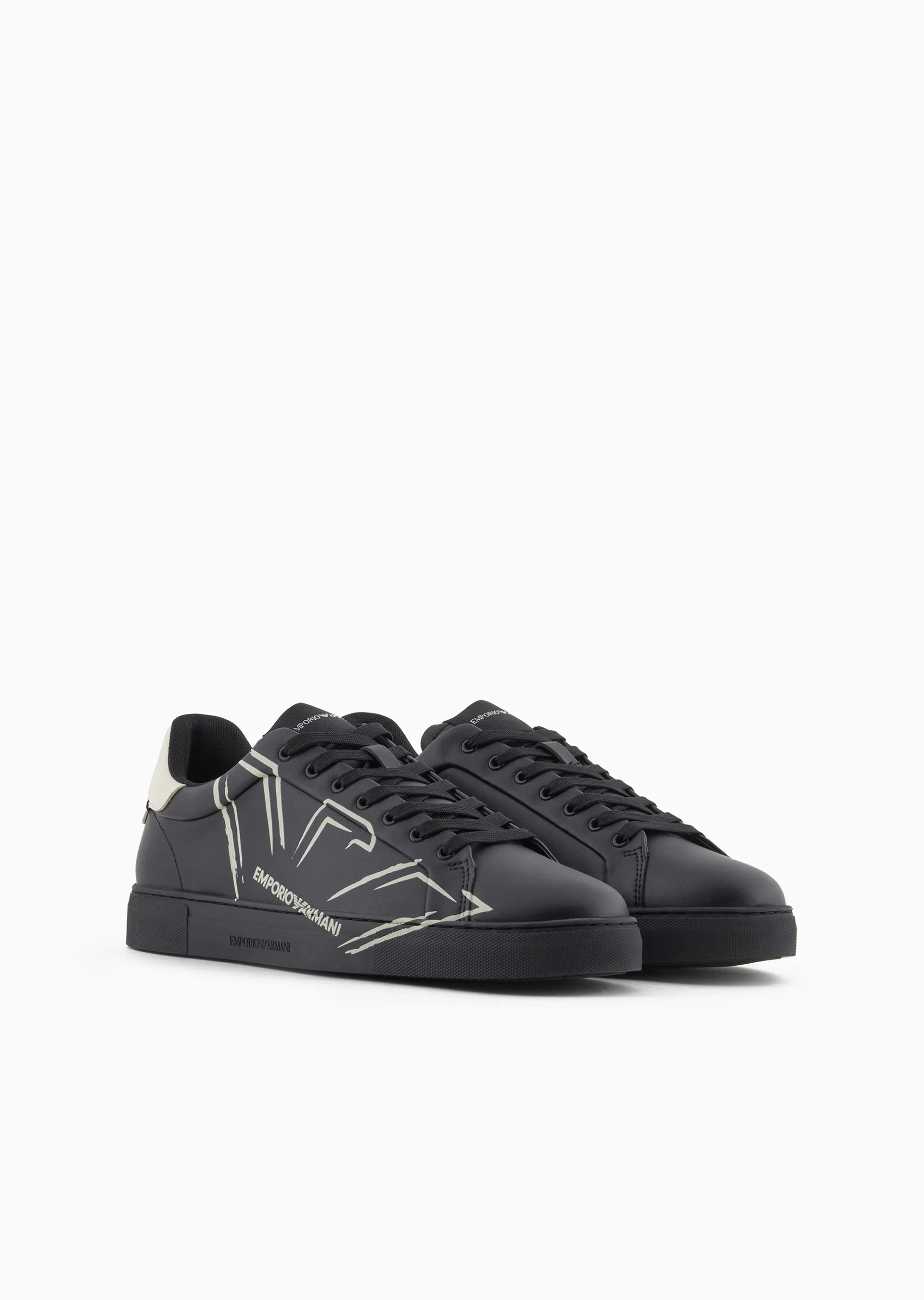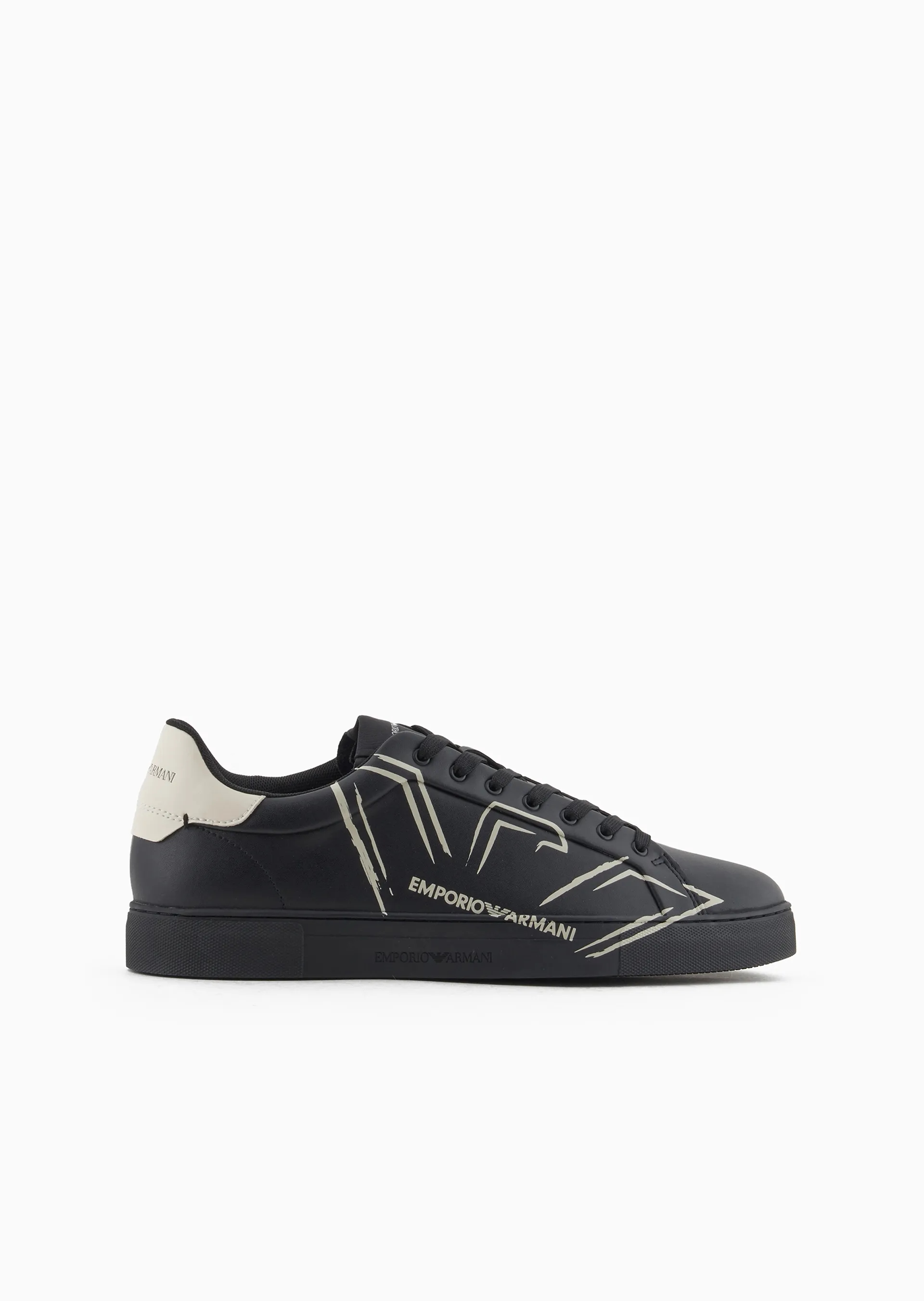 Cowhide sneakers with digital print of the iconic eagle, featuring a lace-up closure and enamelled eyelets matching the upper. Logo back tab. These minimalist, modern sneakers are perfect for everyday city wear. Featuring the Emporio Armani logo on the side of the sole.