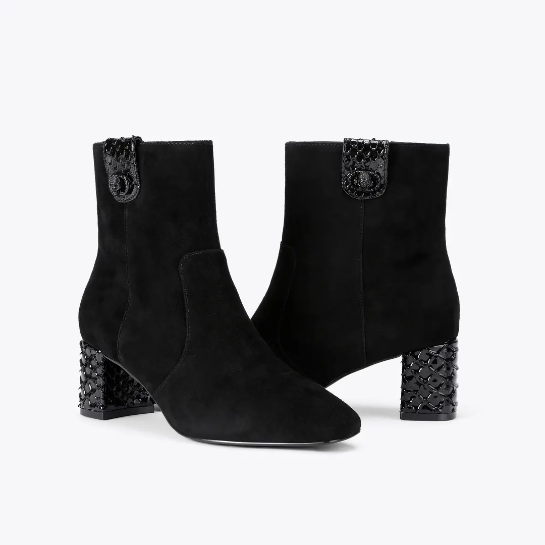 This Chelsea Trim Ankle Boot is crafted from a black suede. There is a 3D lizard embossed tab on the ankle which compliments the block heel.