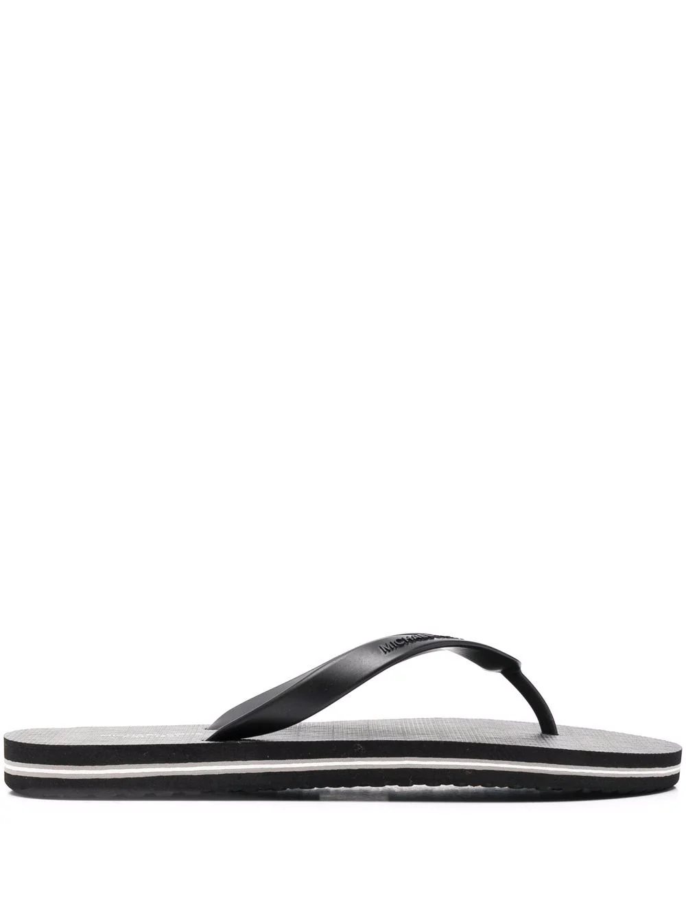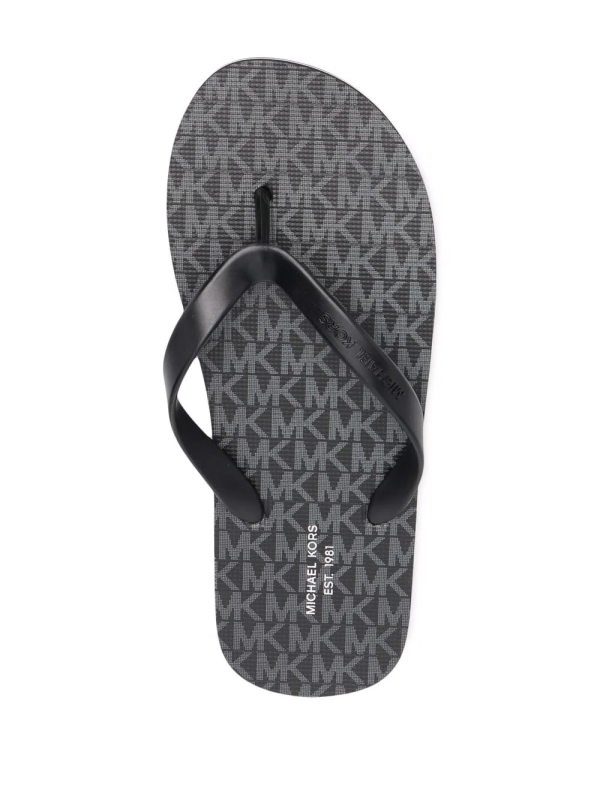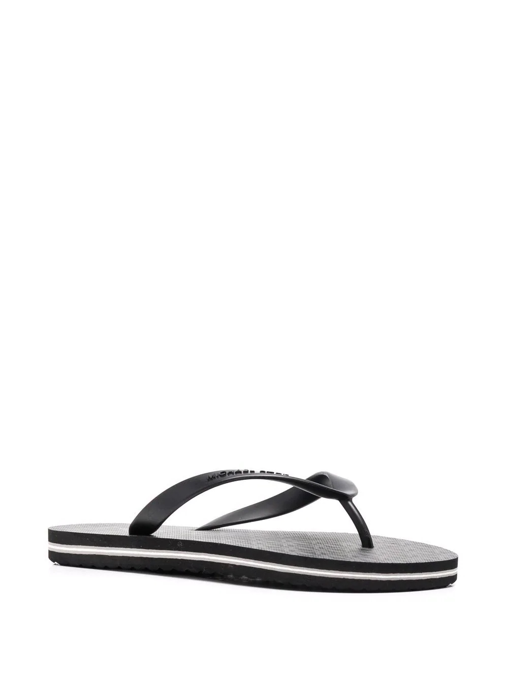 Black Travis thong-strap flip flops from MICHAEL KORS featuring logo print to the front, thong strap, slip-on style, flat rubber sole and branded insole.