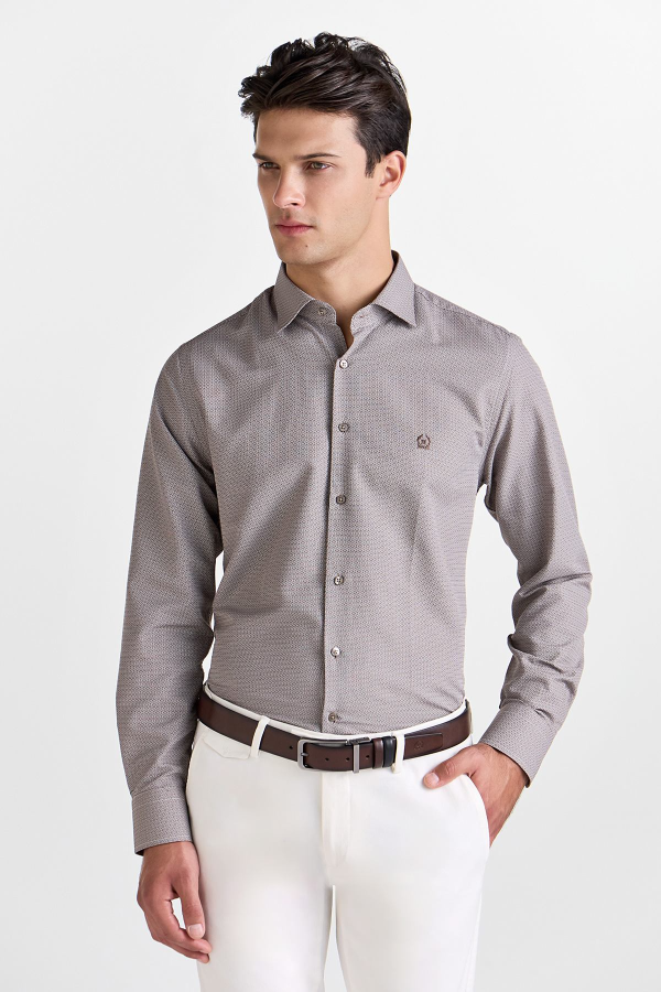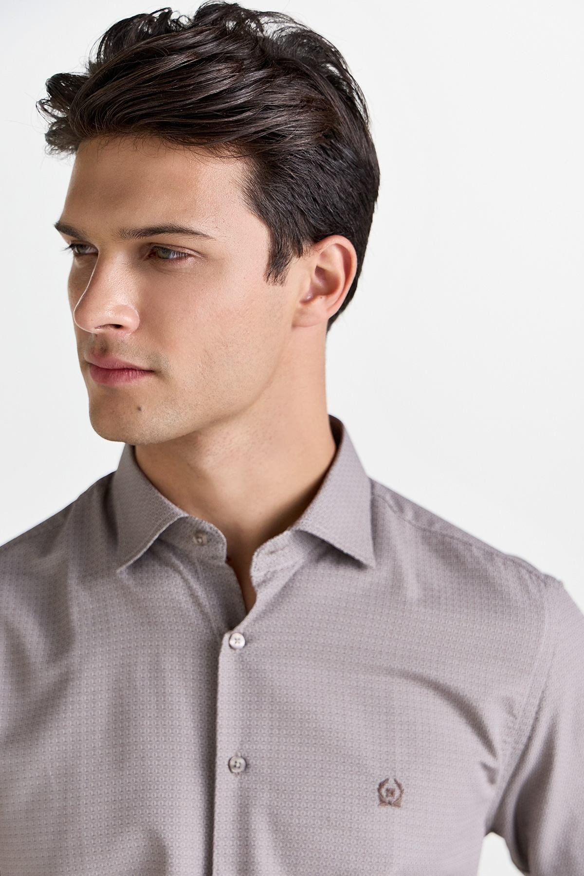 Mens mini jacquard shirt in beige and brown, from Monte Napoleone. Under the collar there are buttons to hold it in place when worn without a tie. It has the companys monogram embroidered on the right chest. Excellent quality, perfect fit and special design details, in an easy-to-wear shirt, which you can comfortably combine with chinos and jackets, ideal for business chic, casual chic and smart casual looks. You are looking for complete proposals in the MonteNapoleone Collection.