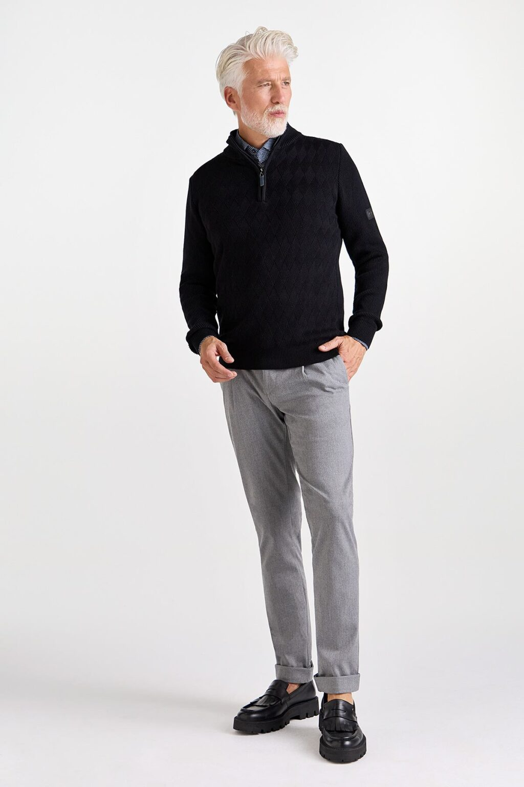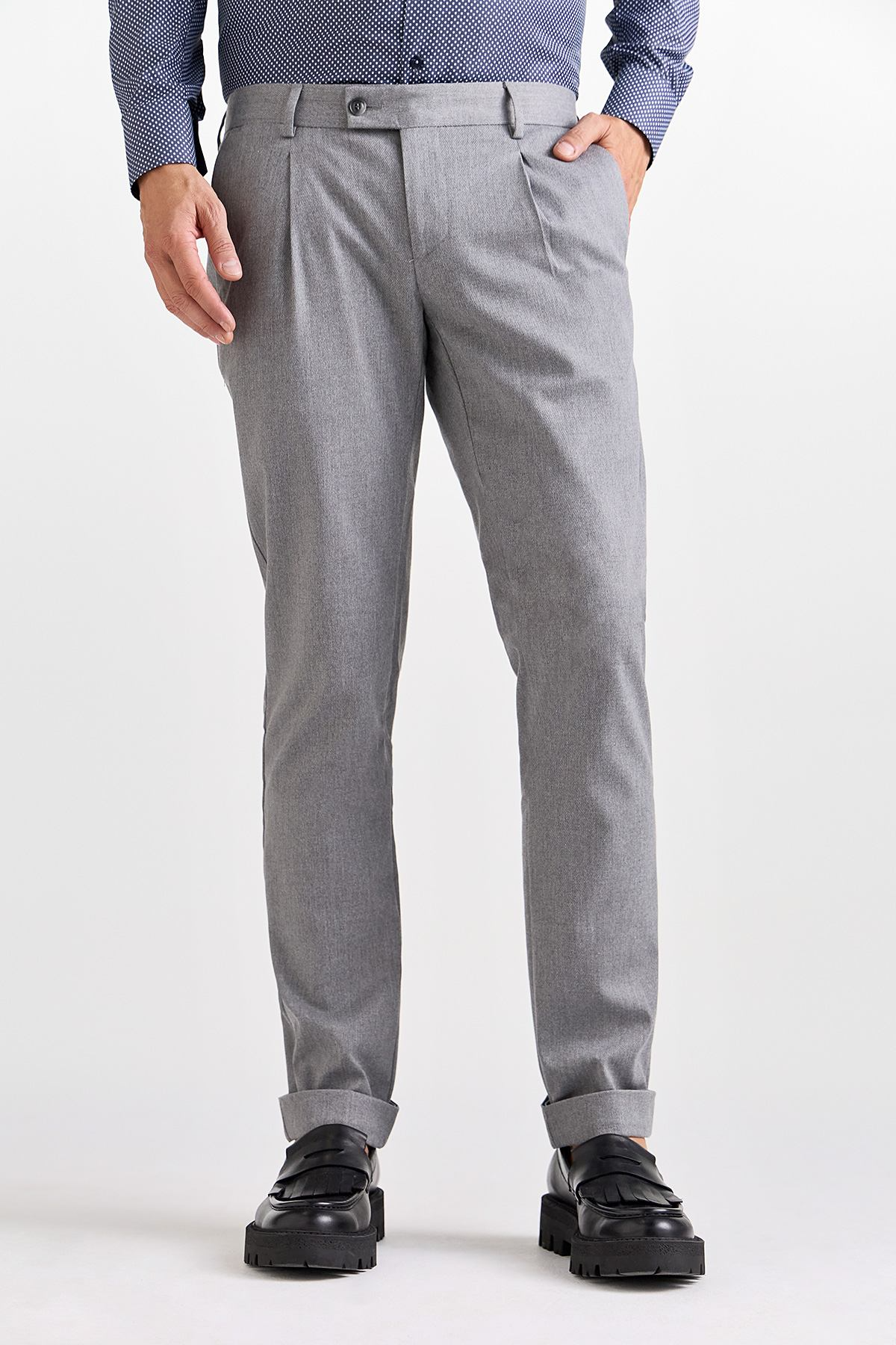 Mens Chinos in gray melange in a narrow line, with a single pleat in the front and lapels at the end. Extremely elegant and comfortable, it is easily combined with many pieces from the MonteNapoleone Collection and is ideal for putting together formal, business chic and casual chic outfits. With MonteNapoleones distinctive fit and construction details. Open seam on the waistband that allows the girth to be adjusted at the waist and our company logo embroidered tone on tone on the right pocket. High quality and perfect fit in a tailor made pair of trousers that will add sophistication to your every look.