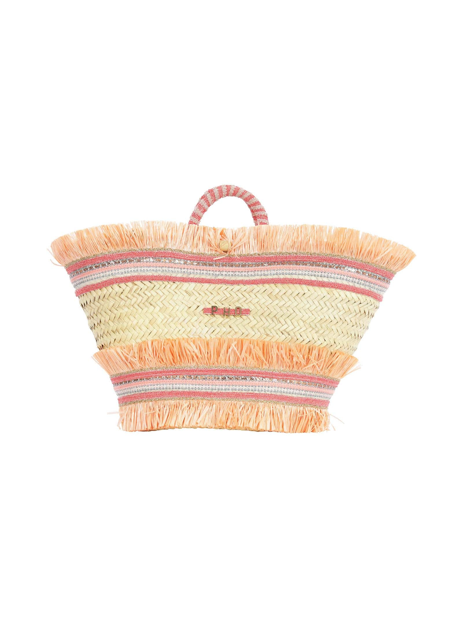 Pho Firenze beach bag in straw and beige fabric, rigid model with fabric handles, all over decoration with multicolor fabric bands, sequins and orange fringes. Gold lettering logo on the front.