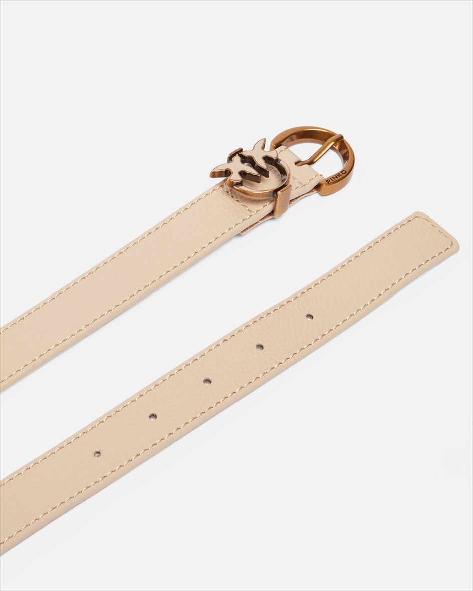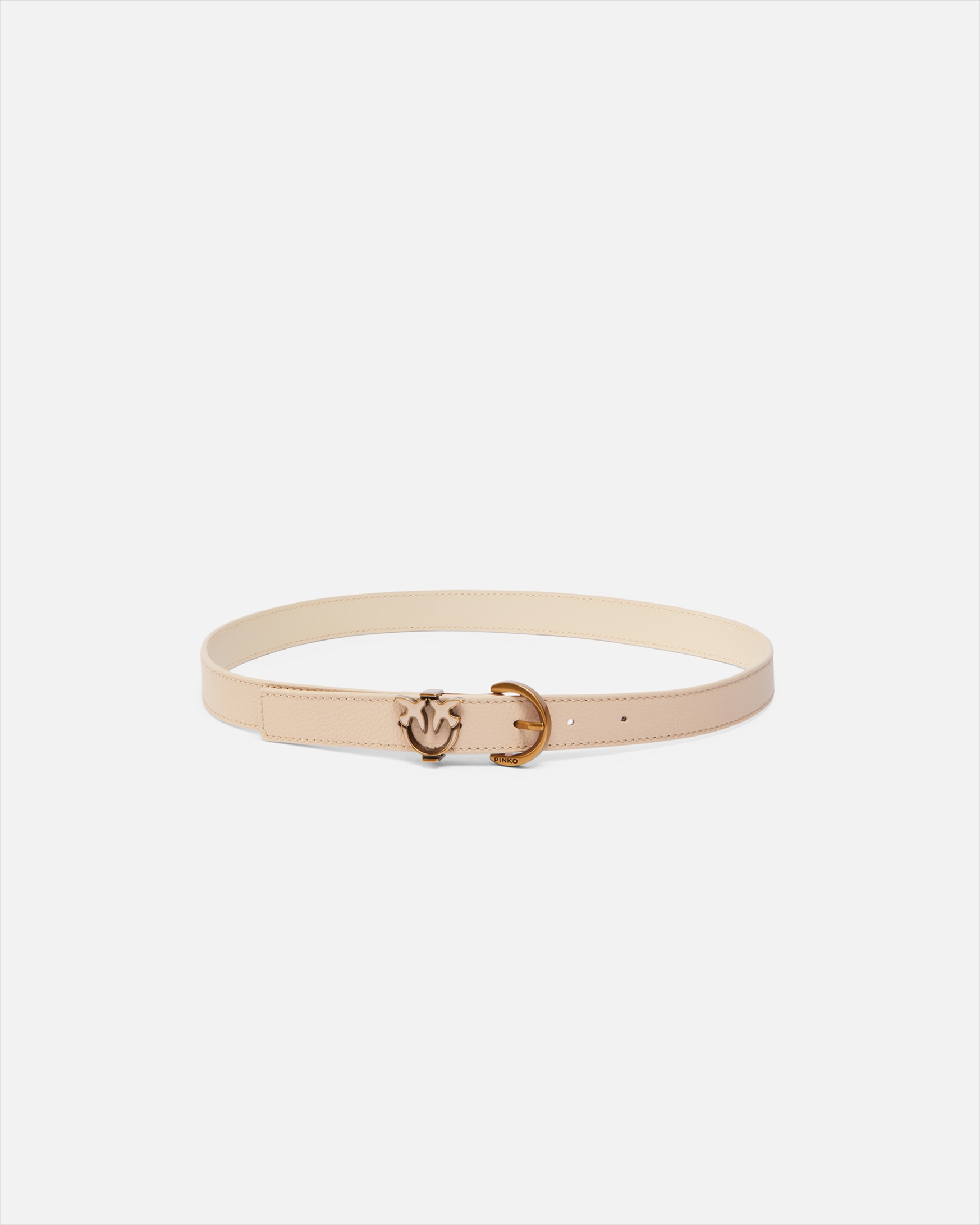 Thin tumbled leather belt with metal detail bearing the Love Birds Diamond Cut plaque and antique gold-electroplated half moon-shaped buckle.