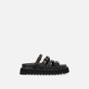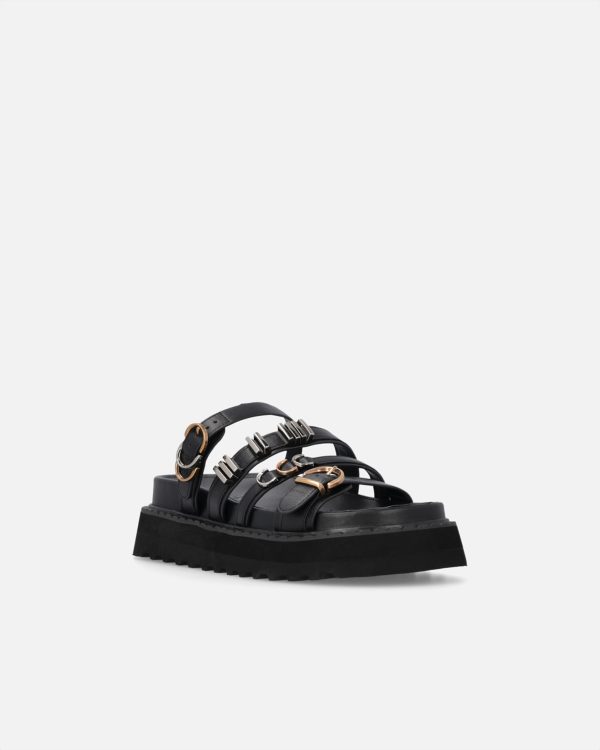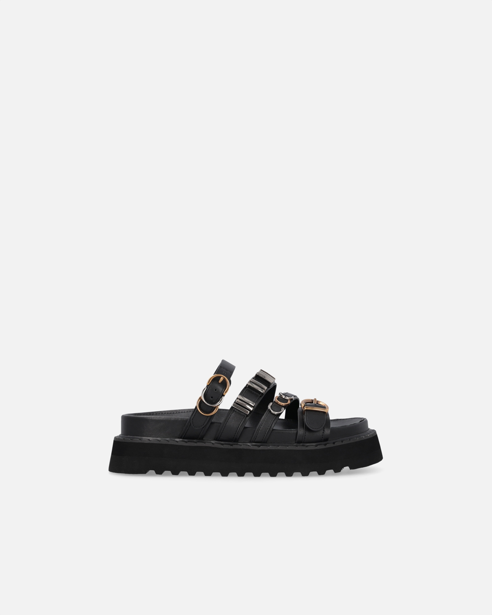 Slip-on wedge sandals in smooth, high-quality leather with strappy upper with buckles, rings and metal appliqués sporting various electroplated finishes. The sandals feature a 3.5cm wedge with milled sole in EVA rubber, a material with a particularly light, ductile and spongy look. The lining and lightly padded insole are made from leather. Sporting a chunky rocknroll shape yet ultra-light at heart, these strappy slip-ons are designed to lighten any look with their minimalist aesthetic.