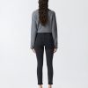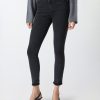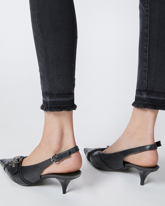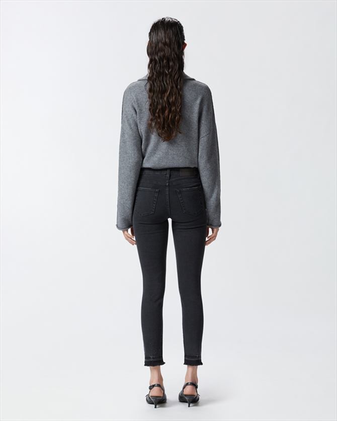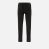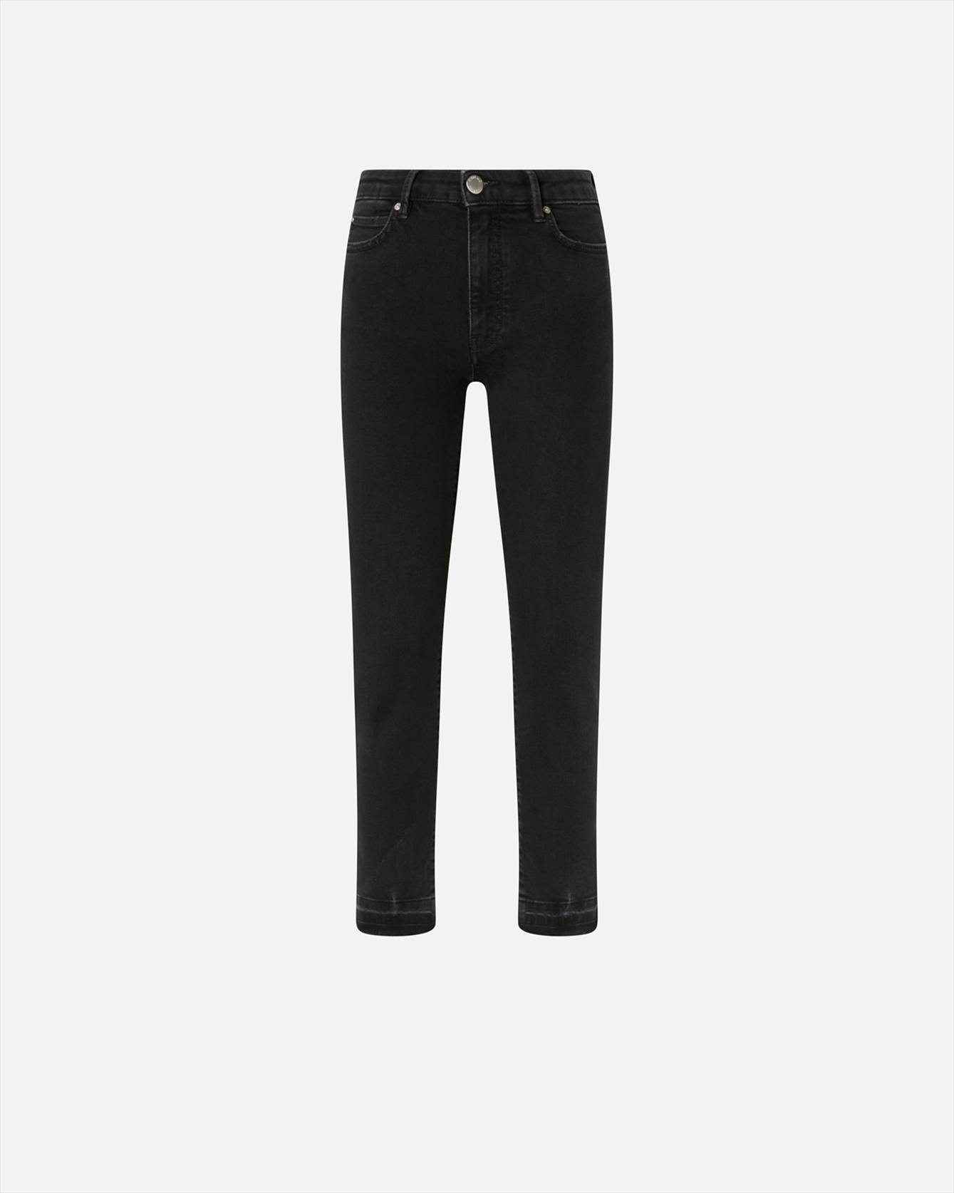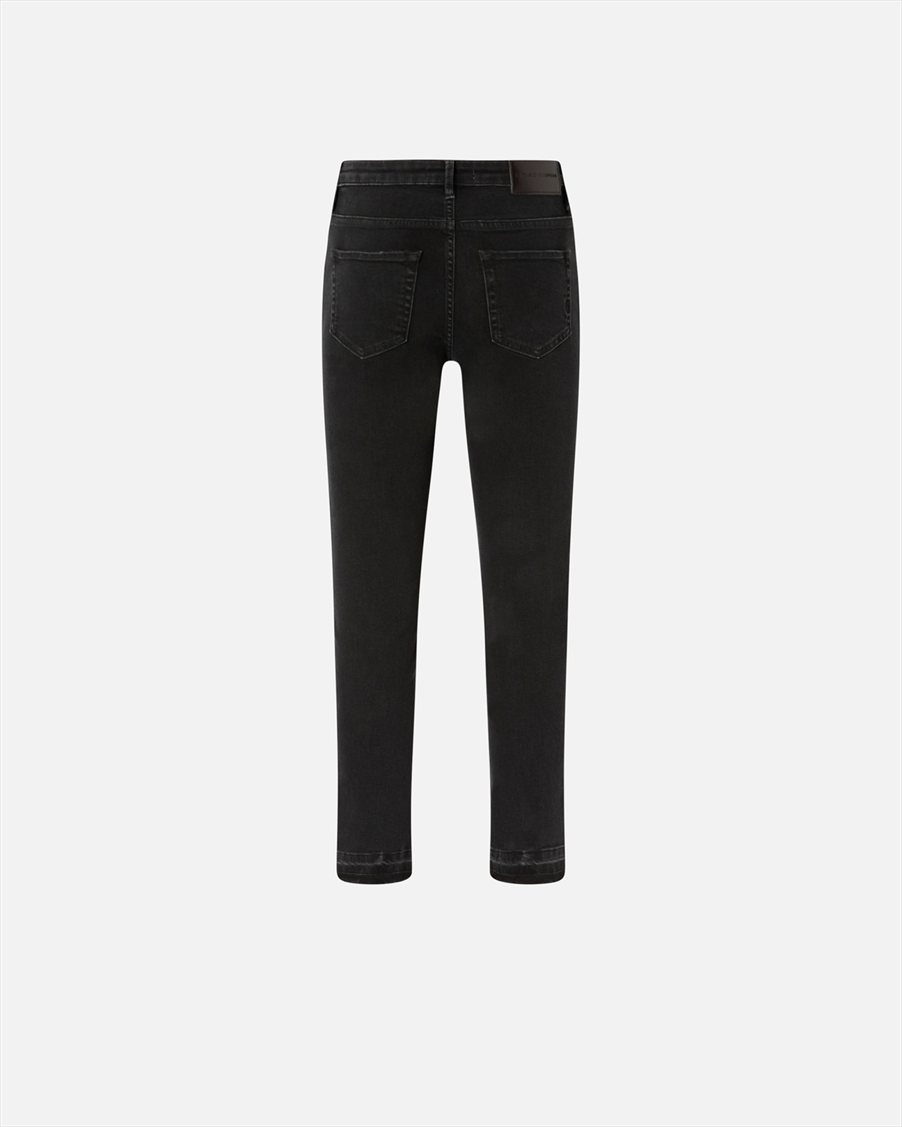 Five-pocket jeans with a skinny silhouette, characterised by a very tight fit, in black stretch denim. Mid-rise waist with belt loops and close-fitting leg with raw-cut and reserve-treated bottom hem for a contrasting colour effect. Zip and metal stud button fastening.