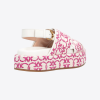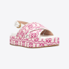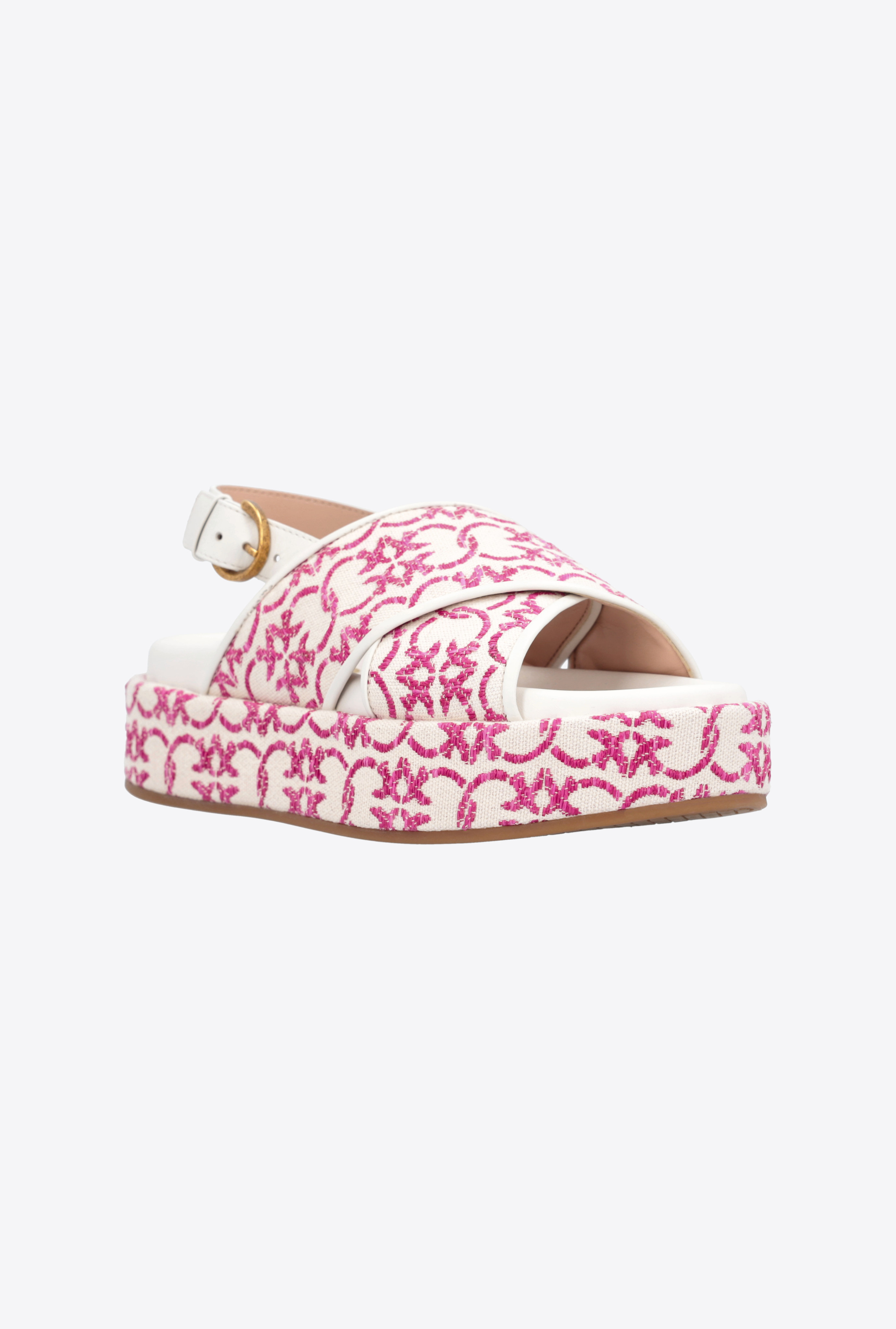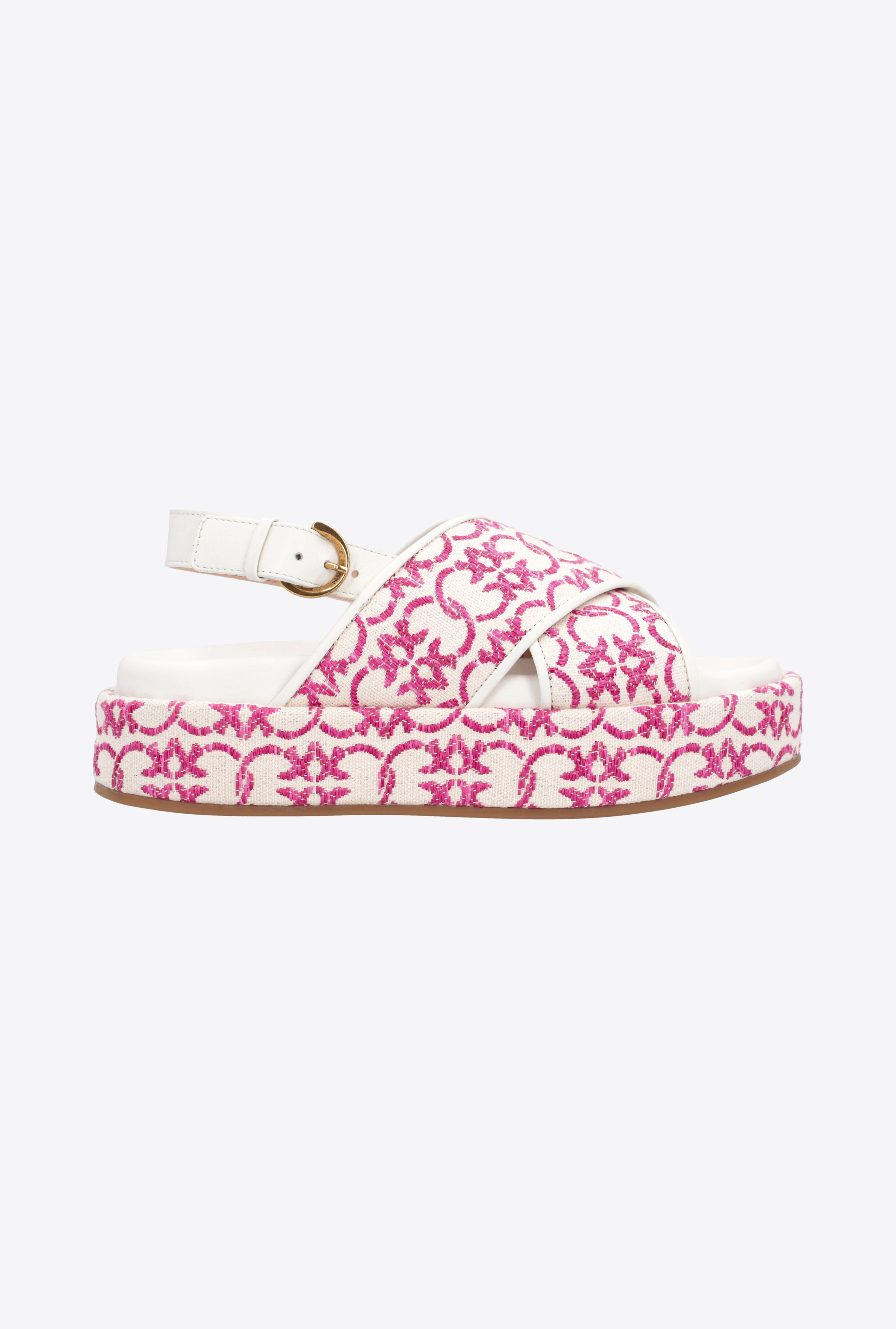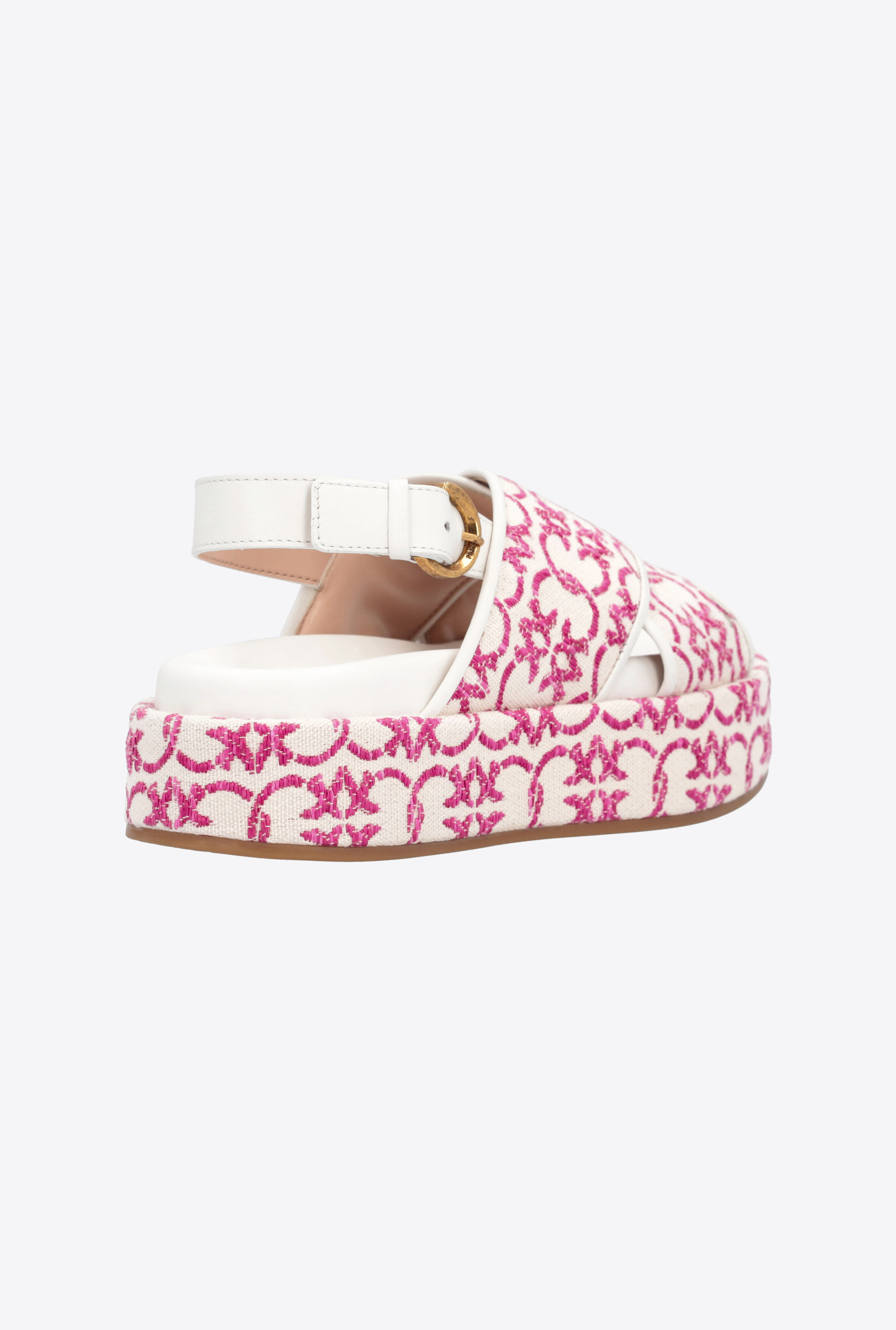 Platform sandals with two woven jacquard fabric front bands featuring the Love Birds Monogram motif and leather ankle strap with circular metal buckle. Rounded toe, 4 cm-high rubber sole, leather lining and soft insole.