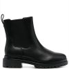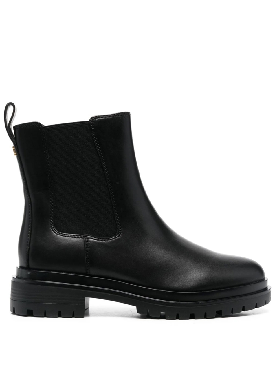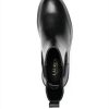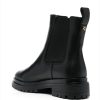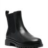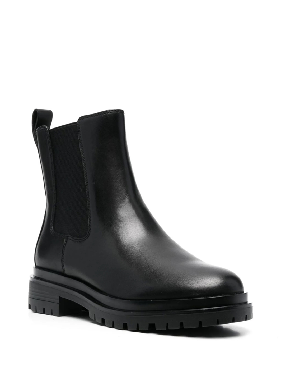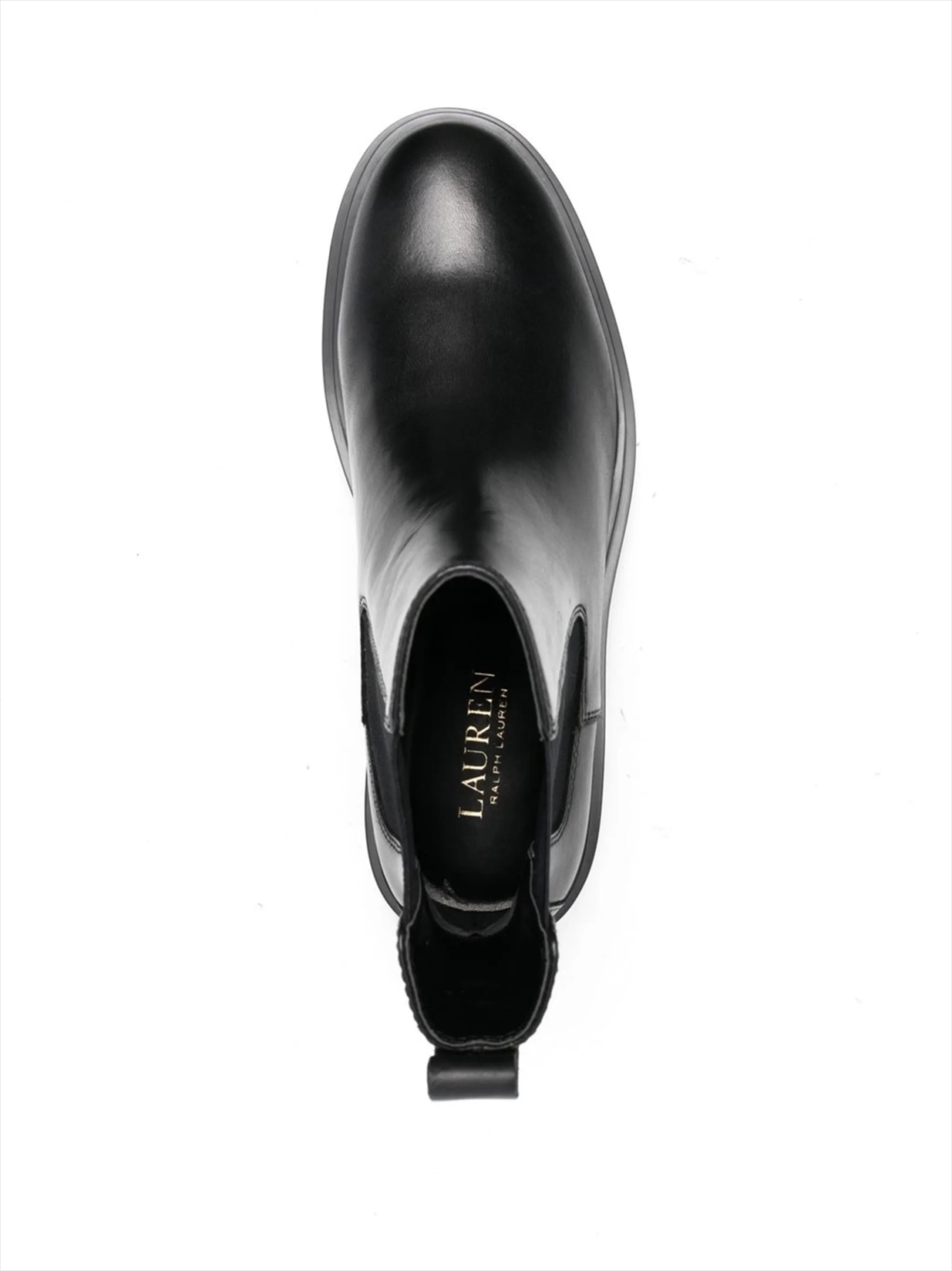 jet black calf leather ankle length pull-tab at the heel elasticated side panels round toe branded insole ridged rubber sole